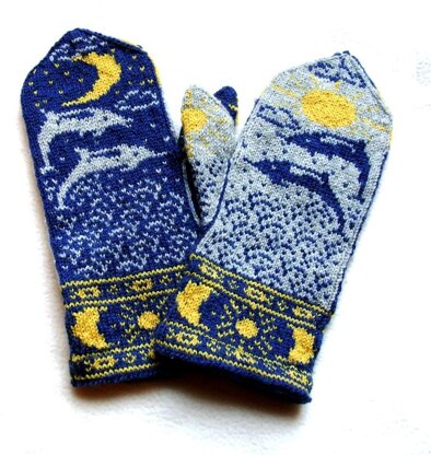 Dolphins race playfully beneath the brilliant solstice sun and moon.