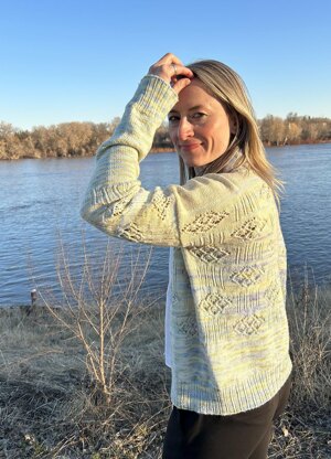 The Sun Shower cardigan is inspired by the unpredictable sunshine, clouds, and showers that herald the arrival of warmer weather. It’s designed light-weight, loose-fitting and airy for a casual, “ready for summer” feel. Special features include French lace “shower” vignettes that look like cloud bursts alternated with “rain” ribbing, and an optional fade gradient to suggest sunshine beyond the rain.
