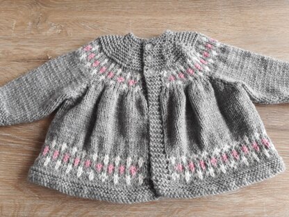 Beautiful round yoke cardigan with a 10 row border pattern at the bottom edge and below the yoke. A garter stitch edging and yoke complete the design.