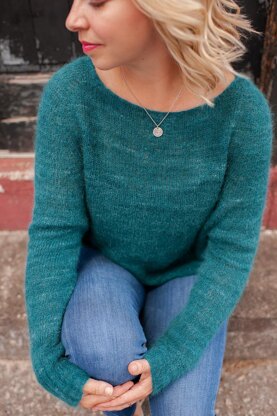 It's so comfy you'll want to wear it with your pajama pants and lounge around all weekend but it's so cute you'll need to find somewhere to go to show it off. Choose your yarn intentionally; this looser gauge begs for a luxuriously blooming fiber. Sweater is worked from the top down with raglan-style seamless sleeves, an extra long yoke with just a slight a-line in the body & the perfect center neckline detail. Optional instructions are included for a hi-lo hem (shown in Solid Version) and stripes. Pattern is designed for adventurous beginning knitters. Shown in Size 3 with 5"/12.5 cm positive ease.