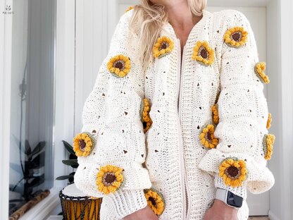 OH sunflowers! Beautiful 3D sunflower🌻 granny squares mixed with white easy-to-make granny squares, this crochet granny square cardigan is perfect for summer and definitely a mood booster. The pattern comes in two sizes, see details below, worked with light yarn and decorated with ribbing boarder.