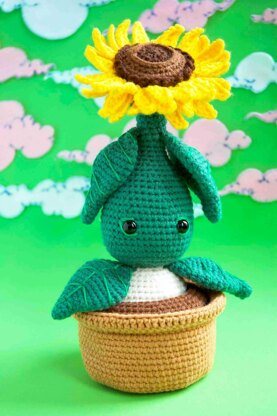 The soil and the pot are crocheted separately and then put together. Use the yarn and matching crochet hook of your choice. The result will be bigger or smaller, keeping the same proportions.
