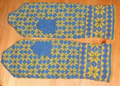 I love to design with motifs from long ago and to knit in a high gauge for lots of detail. This mitten (3 sizes) and hat (2 sizes) set was inspired by a sweater from Sunnhordaland, Norway, knitted in the 19th century. I first saw this sweater in the book Nordic Knitting by Susanne Pagoldh, Interweave Press, 1991. I love the two types of stars, which the Norwegians call "eight-petaled roses". Although I chose Swedish colors for this pair of mittens, I think the design would look lovely in any number of color combinations. I added a facing for the cuffs and the brim of the hat to increase warmth and longevity. This is created with a provisional cast-on and a picot turning-edge for a crisp beginning to all the pieces. The gauge is high and requires a lot of patience, but you will be rewarded with an heirloom quality hat and mittens set.