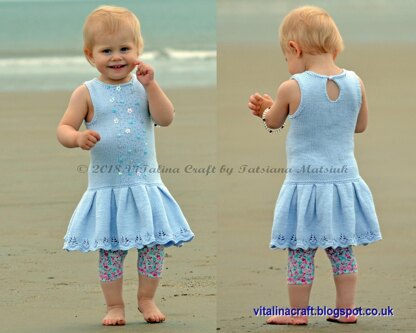 Knitted with Sport/5-ply weight cotton yarn Sunny Coast dress is perfect garment for summer fun. The dress is knitted in the round up to underarms, then front and back parts are knitted separately back and forth. Starting with longer circular needles you need to knit skirt part, form pleats and then switch to shorter circular needles to continue knitting the dress body. After top parts of back and front are finished, the shoulder seams are closed and the stiches are picked up for the neck finishing. The dress can be decorated with beads, buttons and other craft suppliers. Alternatively, the front of dress can be decorated with the knitted flower from my Knitted Flowers Collection.