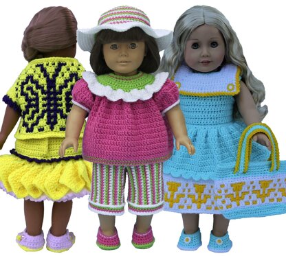 Sunny Day Sensations for 18" Dolls, #119. Create these sensational outfits for your American Girl, Springfield, Gotz or similarly sized 18 inch dolls. There are three completely different looks. Butterfly Outfit features dress with dropped flounce, sandals, and a unique vest with back butterfly detailed (all color changes are at beginning of rnds and you are only working with one color at a time--so easy). Flower Bud Outfit with dress, shoes and tote bag featuring a flower bud with all color changes again done at beginning of rnds--you are only working with one color at a time. Capri Outfit has unusual vertical-striped capris, blouse, hat and shoes. All are made using baby, sport or DK weight yarn.