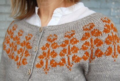 Sunset Primrose is a garden-inspired cardigan (it’s a gardigan!!) knit seamlessly on circular needles from the top down. The yoke features stranded colorwork in a folksy floral motif. A column of steek stitches is built into the design for knitting in the round without interruption; the steek is then cut, and stitches picked up for the front button band and placket. (To knit a pullover version, simply eliminate the steek stitches.)