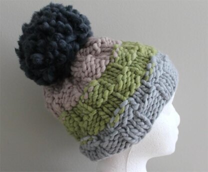 This bulky knit hat is great for those very cold winter days. It is a quick knit and great for a gift. You can knit it in 3 colors as shown or just in one solid. it is knit on a US #15 needle at 2 stitches per inch. The giant pom pom makes it fun and festive this season.