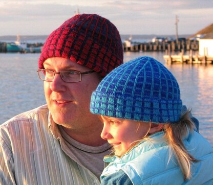 Adult hat shown in Scarlet and Navy. Child's hat in Turquoise and Royal Blue.