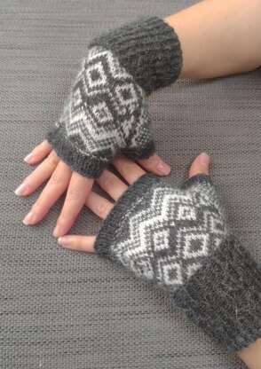 These cosy fairisle mitts are worked in the round from cuff to palm and feature a geometric design. Knitted in supersoft alpaca - perfect for winter. They have a long ribbed cuff which can be folded over to the length you find most comfortable. A pair of mitts can be knitted with two 50g balls of 4-ply yarn (one of each colour), leaving plenty to spare for other projects, so they are affordable to make and make perfect gifts. Would look wonderful in a variety of colour combinations. Shown here in a charcoal and white combination, which goes with everything.