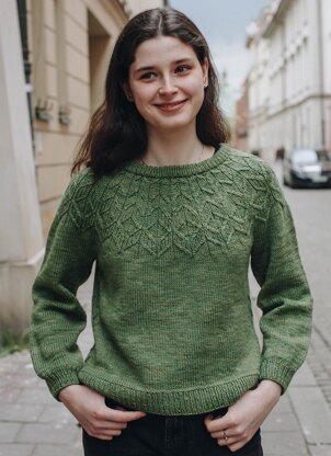 Susaen is a top-down seamless yoke sweater that is knit in the round. There is a double folded ribbed neckline followed by a textured yoke featuring knit, purl and travelling stitches, inspired by motifs from the Danish nightshirt tradition. Once the textured yoke charts are completed, there are short rows across the back in order to raise the back neckline, creating a more comfortable fit. There are textured panels running down both sides of the body. There is optional waist and hip shaping to add feminine shape, and the hem and wrist cuffs are finished off with ribbing.