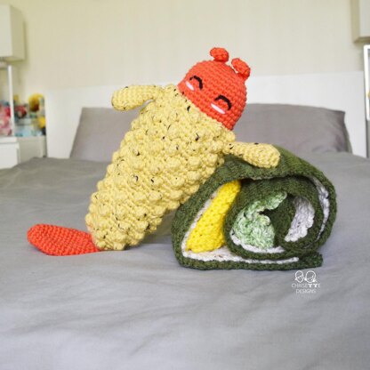 I wanted to make him something he could interact and play with! The shrimp plush and all the textures on the blanket are sure to keep any baby entertained! The egg is an attached pillow that can help with baby practicing tummy time! Or just for naps :) First layer: Green Seaweed Second Layer: White Rice Filling 1: Avocado Filling 2: Eggs Filling 3: Breaded shrimp If you get bored making blankets like I do, this could be one you like! Every section uses a different stitch to keep it from getting too repetitive.