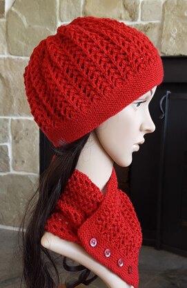 This stunning 4ply set includes a buttoned Neck Scarf and matching Beanie. They are both worked in lace, with garter stitch edges.