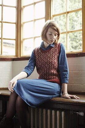This low-necked vest features an all-over Fair Isle pattern. A vertical-striped steek is used for the armholes and front neck, allowing the entire garment to be knitted in the round. Steeks are sections of “waste” knitted fabric that are later cut to create the openings. Short-row shaping is also used to create an elegant shoulder line.