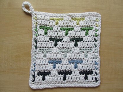 This is a pattern for a beautiful mosaic crochet potholder inspired by swallows flying across the sky, wings outstretched. It includes the written instructions and a chart to work from. Made with 7 colours in 100% cotton yarn.