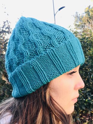 This hat will keep you warm on cold winter days. Easy to make, worked in circular and with a bottom up construction. Light weaves alternating with the ribs make this hat very elastic and therefore easily adaptable to various head circumferences. Unisex model.