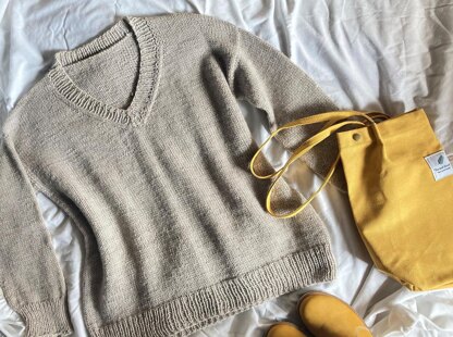 GARMENT CONSTRUCTION: The sweater is worked in the round from the bottom up to underarm. Front and Back are then divided and worked separately, knitted flat. Sleeve stitches are picked up and sleeves are worked in the round to cuffs. The V-neck is finished last.
