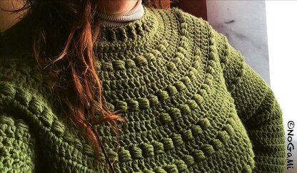 Jersey a ganchillo top - down sin costuras, con canesú redondo y punto fantasía. Nivel intermedio. Disponible en tallas L M y S. Y ajustable a cualquier talla. Se teje con aguja del Nº5. Hilo original Dralon.