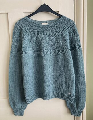 The sweater is worked seamless from the bottom up. Sleeves are worked first then set aside. Body is worked from the hemline to underarm then sleeves are joined the garment is worked to the top. A pretty pattern is added to the yoke. The length of the garment can be easily adjusted.