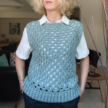 One version was crocheted using Bulky yarn but as it is a made-to-measure pattern, it can be crocheted in any weight yarn and fiber! Acrylic makes for a super cosy and more sturdy make but a cotton yarn would give a lovely drape to your sweater vest and a whole different look altogether as you can see in the other version. The pattern explains how to crochet the right size for your needs.