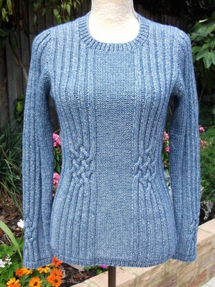 Beautifully feminine, this sweater has a vintage touch with it's perfectly placed cabling to give just the right amount of shaping to the silhouette. The celtic cabling is worked on the wrist sections to match.