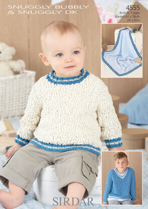 Sweaters & Blanket in Sirdar Snuggly Bubbly DK and Snuggly DK - 4555 - Downloadable PDF is a Knitting pattern by Sirdar, available as a Downloadable PDF and includes instructions in English. Super fun to make, this pattern could be your next masterpiece!