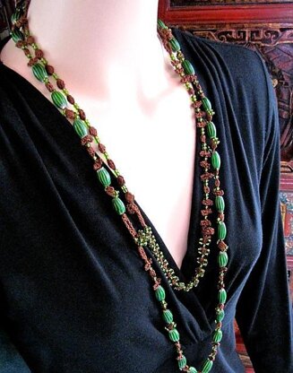 My goal for the necklace was to find a way to crochet with oblong-shaped beads so that no stitch strands cover them. I think of the featured stitches as "jewelry quality" because they don't have an obvious wrong side, and drape more symmetrically with less unintended twisting.
