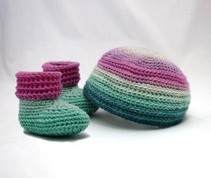 You get both the booties and matching beanie in one pattern. Both come in two sizes: 0-6 months and 6-12 months so you can make two sets to grow with the baby.