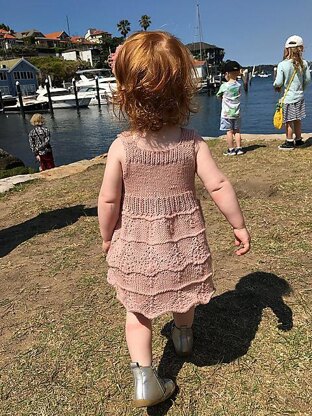 This dress comes in sizes 3 months to 4 years. It is worked in the round bottom-up to the armholes, then back and forth to the shoulders. A small seam is required to join at the shoulders.