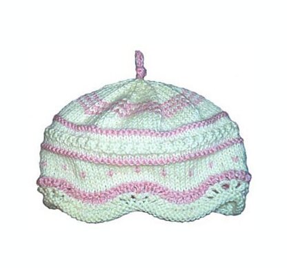 This is a lovely baby hat for that special little girl. It's an easy knit and uses a dab of colorwork for special effect. The yarn used is Debbie Bliss' Merino DK. This is a soft, dk weight with great stitch definition. You will need to know how to knit in the round. I am available for knitting help via e-mail.