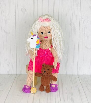 Materials: I used Alize Bahar yarn (100% Mercerized Cotton), weight fine (#2), 2 skeins (1skein is 100g/3.53Oz.,260m/274yds). Color – lot: 160-138260 Substitute yarn: Patons Grace or Scheepjes Catona. Hair – any material you like: yarn, hair, Machine Embroidery thread. I used Yarn Bee Fleece Lite. For dress and shoes any Aran Cotton yarn. I used Paitbox Aran cotton (70g2.8Oz). For Bear use any light (#3) weight yarn. Doll joints: 25mm for legs and 20mm safety plastic eyes to use as doll joints for hands.