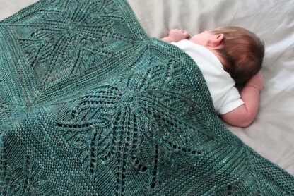 Blanket squares are worked individually in the round from the center out and then joined using a crochet hook. The cable and lace pattern is provided in both charted and written out formats.