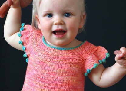 This dress is worked seamlessly from the top down, first flat, then in the round, with a circular/raglan hybrid yoke. A bobble bind off is worked at the flutter sleeve edges. After the sleeves are bound off, an A-line skirt is worked in the round and finished by a bobble bind off at the hem. An applied I-cord is worked for a neat neckline finish.