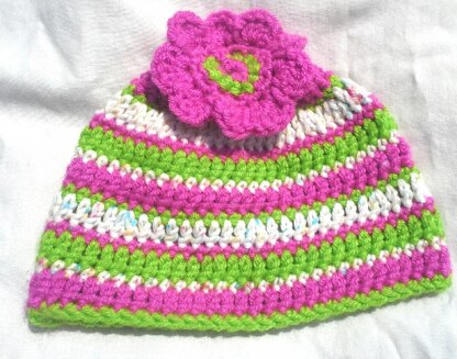 This cute little hat is perfect for infants, with an optional crocheted-in flower for your sweet pea! Leave the flower out for a boy version. Have fun and play with your color options!
