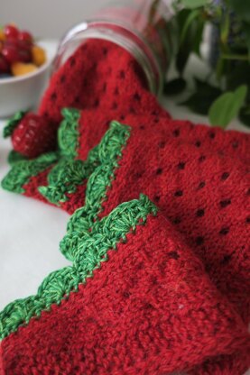 The Sweet Strawberry scarf is an adorable accessory inspired by the beloved, children’s favourite bright red berry. The scarf is knitted in a staggered eyelet pattern, making it soft and lightweight, and is finished on one side with an i-cord border and on the other side with some cute crochet leaves.