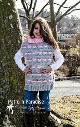 This poncho is a fun piece that doubles as a sweater, vest or tunic! A great fashion piece to add a little extra warmth. The body of the poncho is designed in basic double crochet and the hearts are introduced every few rows for a little sweetness. It is sewn at the sides with a large vent from the waist to the hemline. I love the side closure, split collar too.