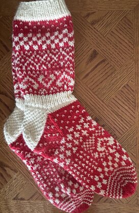 These socks are two-colored (red and white) with some geometric patterns and hearts both in the leg and foot. The size varies between small and large depending on how long you want to knit the foot. The width of the foot is wide, though. The leg reaches to mid-calf.