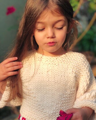 The Sweetie Sweater is a modern, easy, fast-knit pattern, for knitters of all levels. Inspired by the 80’s, this is a modern batwing cropped shape, perfect for wearing over dresses, skirts or jeans. It is knit in garter stitch from the bottom up, in two pieces (front and back), with stockinette stitch heart detail on the front. Large sleeves can be worn long or folded up. Separate detailed instructions, row by row, for each size, make it extremely simple to follow.