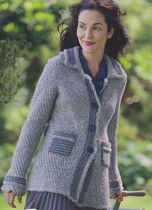 Classic, fitted tweedy jacket with lace detail, set in sleeves and patch pockets. This lovely yarn from New Lanark Mills inspired the tweedy look of this fitted jacket with the slightly unusual lace edge detail. The Knot Stitch is very simple to do, the most tricky part being counting the rows which is most easily done on the wrong side. The optional lace for the edges on collar and cuffs is also fairly straightforward with some degree of complexity in the construction. The instructions for the lace edge of the cuff is to cast on and off with waste yarn then graft the edges together but if you prefer, simply cast on and off in Yarn A and sew the edges together. This jacket is fitted so be sure to check the actual measurements before deciding on the size to make.