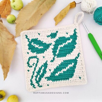 This tapestry crochet Swirling Leaves Potholder is part of my “A Year of Potholders” collection. For this collection, I will be releasing a tapestry crochet potholder pattern every month throughout 2022.