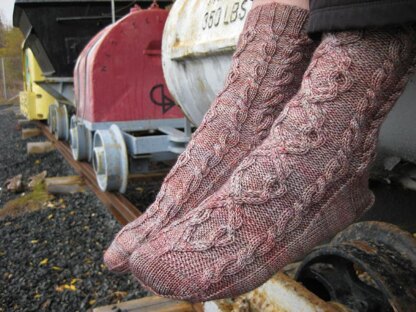These highly textured socks feature an intricate cable and braid panel framed by pretty cable columns. The socks are worked from the top down and the left and right socks are identical.