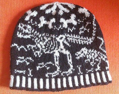 There are 2 big T-Rex skeletons with 2 baby dinosaur skeleton ones on the beanie. Some flying dinosaur skeletons serve as filllers... :)