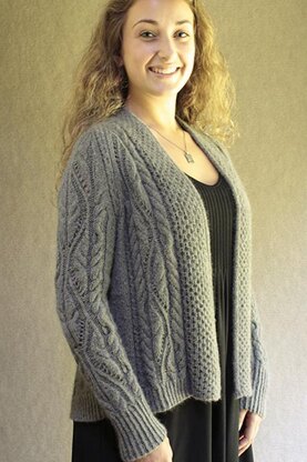 A pretty honeycomb border wraps around graceful cables and lace, balanced with an allover pebble pattern. This artistic open-front cardigan is designed with a subtle high-low hemline - no short rows needed.