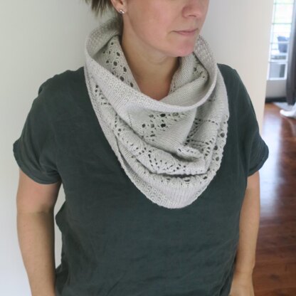 This cowl is worked in the round from the bottom up on circular needles. Decreases are included after the Diamond section to bring the cowl closer to the neck. Along with written instructions, charts for lace sections are included.
