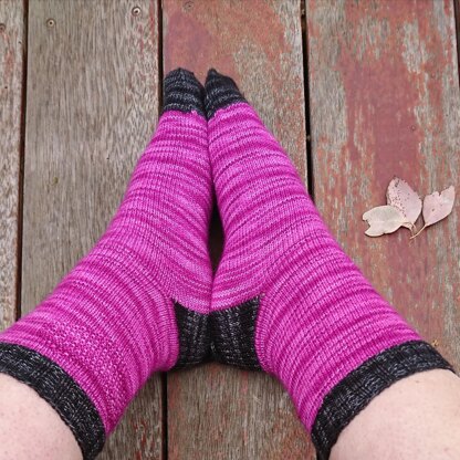 While the sample is worked with contrast coloured cuff, heel and toe, the pattern is suitable for a single yarn.