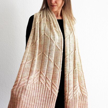 Talida is a large & cosy rectangular wrap, worked from edge to edge with beautiful cables and an optional fading colourplay.