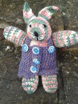 Rabbit Tension: 16 dc x 20 rows over a 10 x 10cm square. DK beaker button bountiful - 50g, about 110m, 4mm crochet hook, yarn needle for sewing up, stuffing, small length of black for face. Dress Tension: DK beaker button bountiful in a contrast colour - 30g, about 70m, 4mm crochet hook, 5 x 1.5mm Dorset buttons, yarn needle for sewing in ends. Buttons 5 brass rings 1.5cm, approximately 1.5m of thread, blunt ended needle.