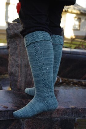 Talvi Vuorelassa are fitting knee-high socks with custom calf increases and a pretty fold-over over a hidden ribbing. They are knitted from the toe up. The heel is a french-type heel.