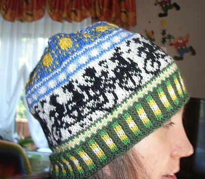 I had this idea about a tandem or more people sitting on a long bike having a dog with them in my head for quite some time. The first one is eager going on, the girl - second in line is looking at you and the lazy boy in third row just put his feet up and relaxes... as long as the first two ones won't notice... ;-) In the little trailer is the dog his ears flying in the wind.... The beanie has a corrugated (= multicolor) ribbing followed by a little daisy peerie. Then come the bikes, a little border pattern with clouds and a big band with the sun. At the top is a big cute flower.