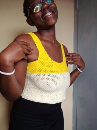 I am currently working on pieces that can be worn on a day to day basis. the tanky tee uses the moss stitch which is very easy to make since it uses sc and chains. The top is very light, airy and easy to style.