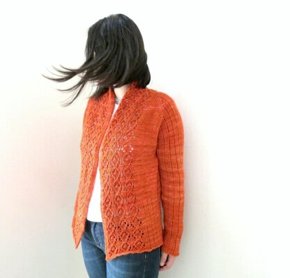A seamless cardigan worked from top down with raglan style sleeves and lace neck band/front edge.